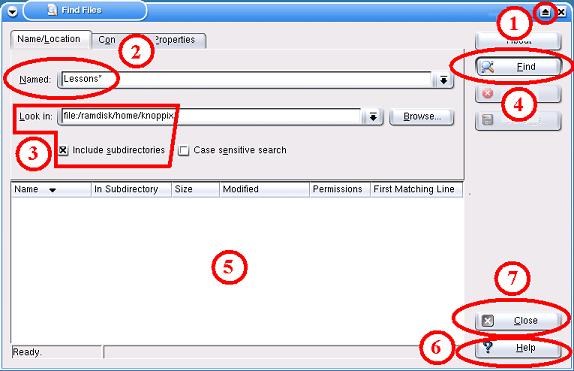 (3) In the field to the right of "Look in:" you can insert in which directory you want to do the search. (if you also want to do a nested search, search within all the folders that are within this folder, and so on, then the check box with  "Include subdirectories" must be checked. In our example we look in /home/knoppix and al directories down in the directory tree.