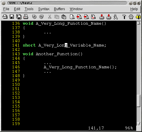 The function A_Very_Long_Function_Name() can be quite exasperating to type over and over again. While still in insert-mode, one can auto-complete a word by either searching forwards or backwards. In function, Another_Function() one can type A_Very... and hit CTRL-P. The first matching word will be displayed first. In this case it would be A_Very_Long_Variable_Name. To complete it correctly, one can hit CTRL-P again and the search continues upwards to the next matching word, which is A_Very_Long_Function_Name. As soon as the correct word is matched you can continue typing. VIM remains in insert-mode during the entire process.