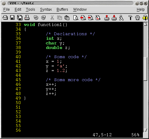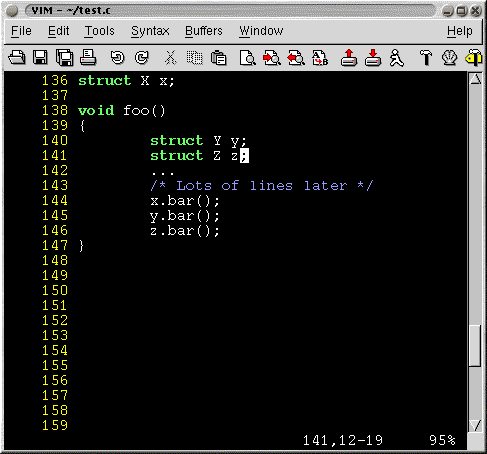 For some reason you've forgotten what y and z are and want to go to their declaration double quick. One way of doing this is by searching backwards for y or z. VIM offers a simpler and quicker solution. The gd keystroke stands for Goto Declaration. With the cursor on "y" if you hit gd the cursor will take you to the declaration :- struct Y y;.