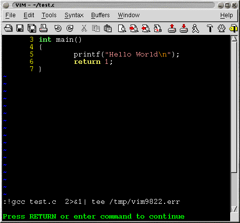 When coding in C one often has a edit-compile-edit cycle. Typically you would edit C file using some the things I've mentioned earlier, save the file, compile the code and go to the error(s) and start editing again. VIM helps save the cycle time slightly using a mode called quickfix. Basically, one has to save the compiler errors in a file and open the file with VIM using the command