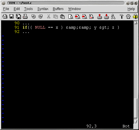 Assume that the cursor is positioned at the beginning of the if statement. By pressing w once the cursor jumps to the first (. By typing w again the cursor moves to NULL. Next time the cursor will move to the == token. Further keystrokes will take you as follows. x... )... &&... y... >... z... and finally )...