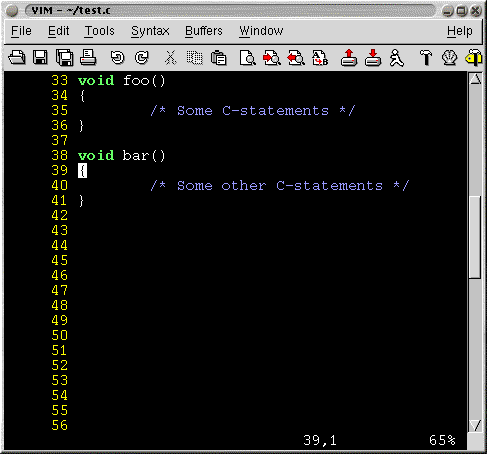 Lets say you were editing foo() and now you want to edit bar(). Just type ]] and the cursor will take you to the opening { of the bar() function. The reverse is slightly different. If you were in the middle of bar() and you type [[ the cursor will move to the first { above i.e. the beginning of bar() itself. One has to type [[ again to move to the beginning of foo(). The number of keystrokes can be minimized by typing 2[[ to take the cursor to the beginning of the previous function.